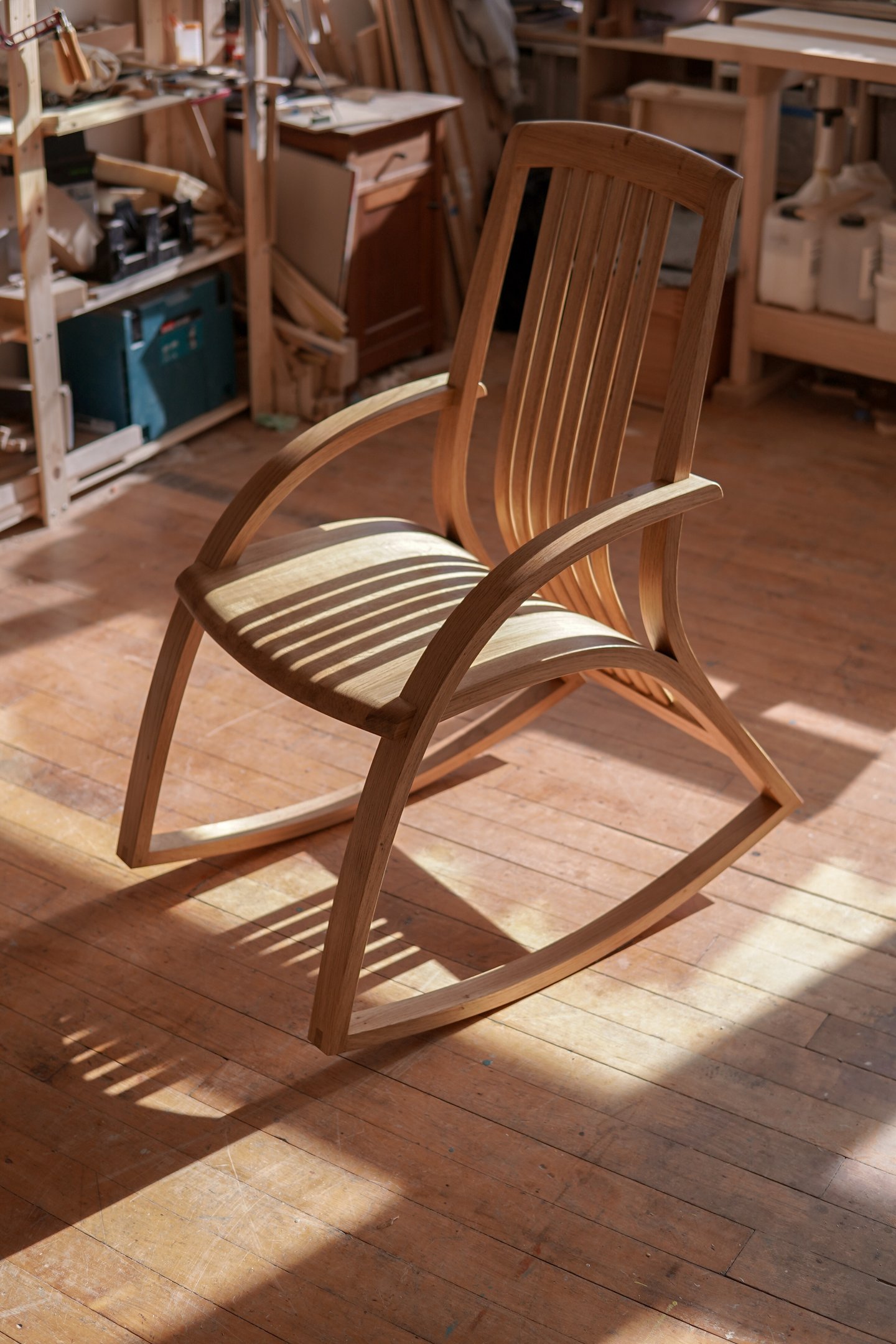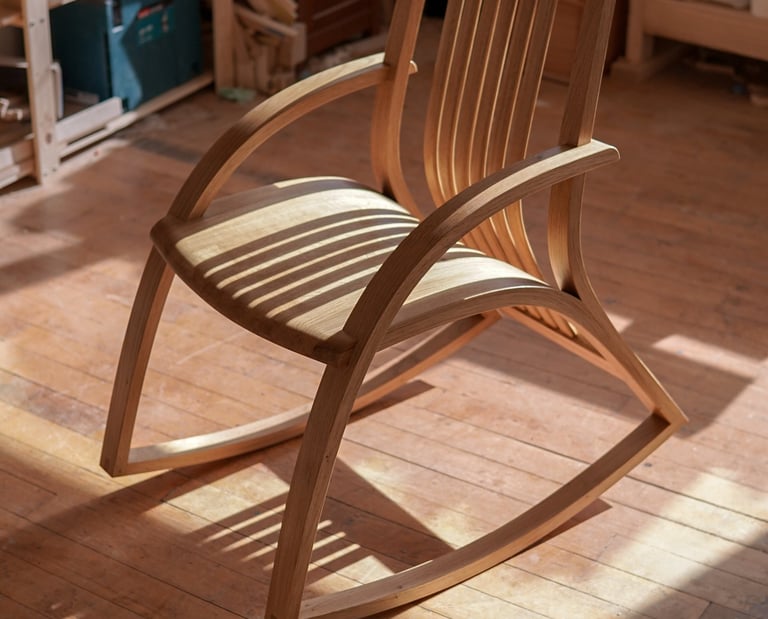 Bespoke rocking chair using traditional steam-bending techniques to achieve its fluid, organic form. Crafted from Scottish Oak, this chair is designed to meet the specific ergonomic requirements of the client.